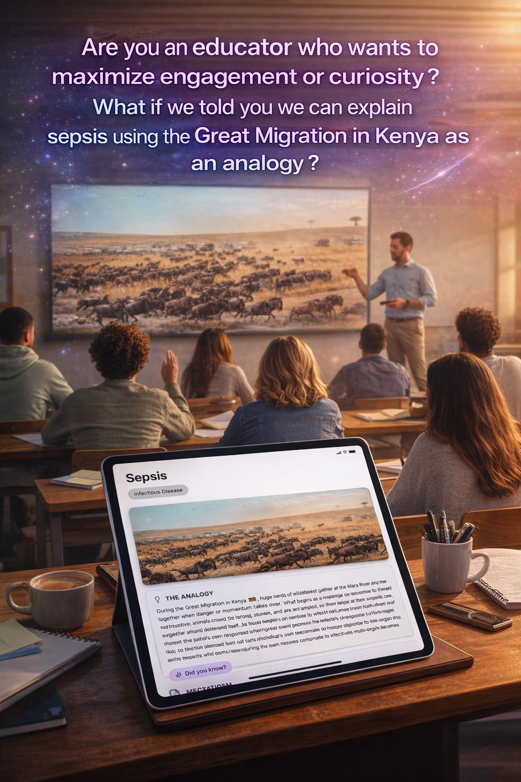 Let us take away the stress of engaging content generation from you. From mind blowing analogies, global health integration to carefully selected patient stories, leave that with us. We will get conversations going in your classroom.